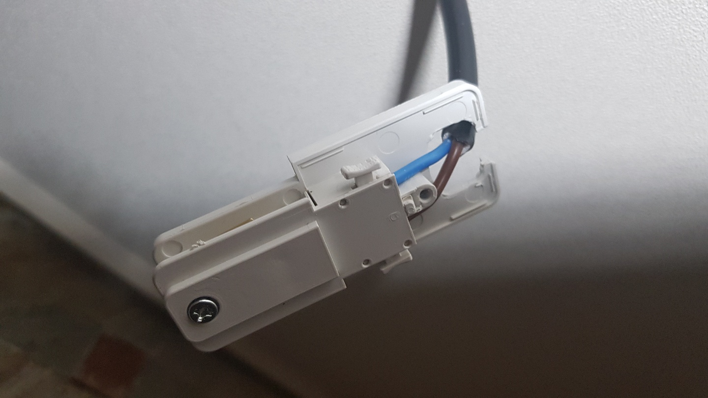 전원은 고정된 천정레일 끝 부분에 연결할 계획이므로 전선을 천정에서 잘 빼서 아래 사진처럼 그 옆에 타공을 하여 전선을 빼두면 된다